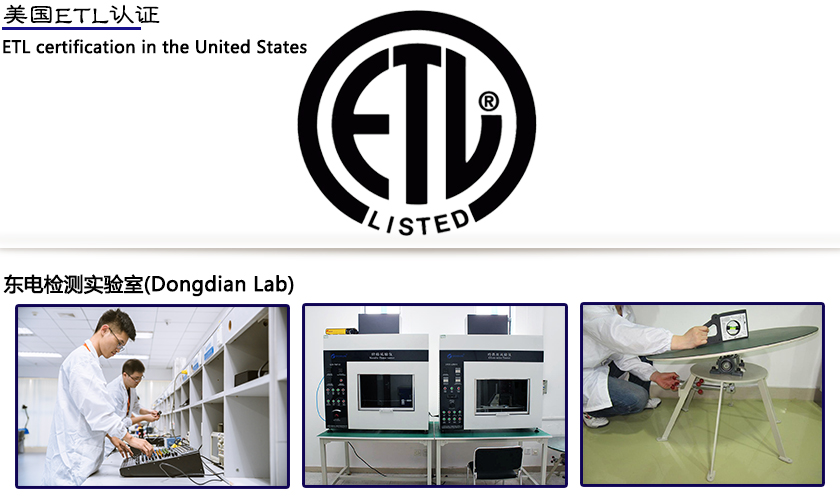 ETL是美国电子测试实验室(ElectricalTestingLaboratories)的简称。任何电气、机械或机电产品只要带有ETL标志就表明此产品已经达到经普遍认可的美国及加拿大产品安全标准的最低要求,它是经过测试符合相关的产品安全标准;而且也代表着生产工厂同意接收严格的定期检查,以保证产品品质的一致性,还有CETL认证,是针对加拿大的认证,一般ETL和CETL可以同时申请,可以销往美国和加拿大两国市场。