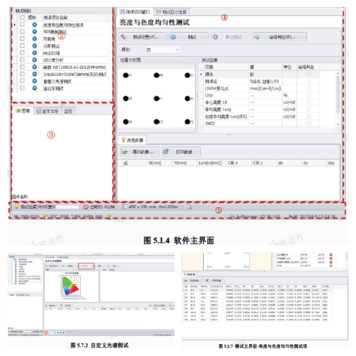 ① 亮度、色坐标、相关色温、相对光谱曲线、色域覆盖率