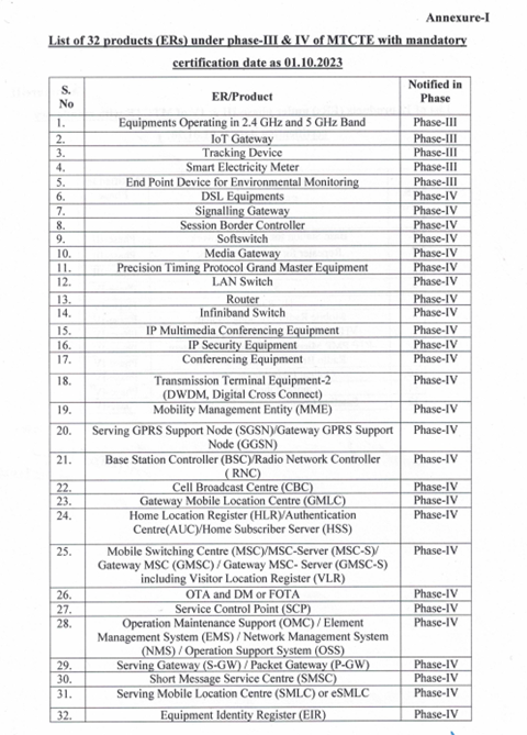 印度电信工程中心(TEC)已于2023年6月23日发布通知,宣布MTCTE强制管控的第五阶段的产品,具体产品如下表所示