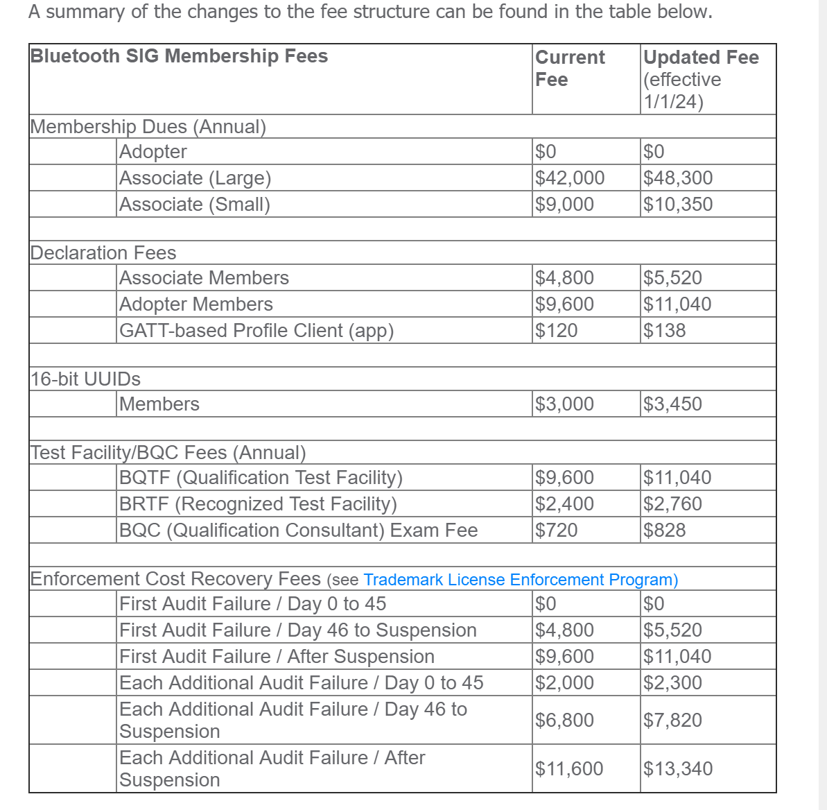 2023年6月27日,蓝牙SIG董事会 (BoD)批准了15%的会员费增长,并将于2024年1月1日生效。2024年一月除了SIG采取适当的成本控制措施外,董事会决定增加费用对于该组织来说是必要的,以支付到2024年的当前和计划的会员服务不断上升的成本。费用结构变化的摘要见下表: