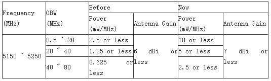 2、5150~5250 MHz 频段的功率限制变高  (详见下表)
