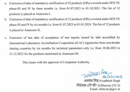 印度电信工程中心(TEC)于2023年9月27日发布通知,延长MTCTE第3阶段和第4阶段产品的强制认证日期。