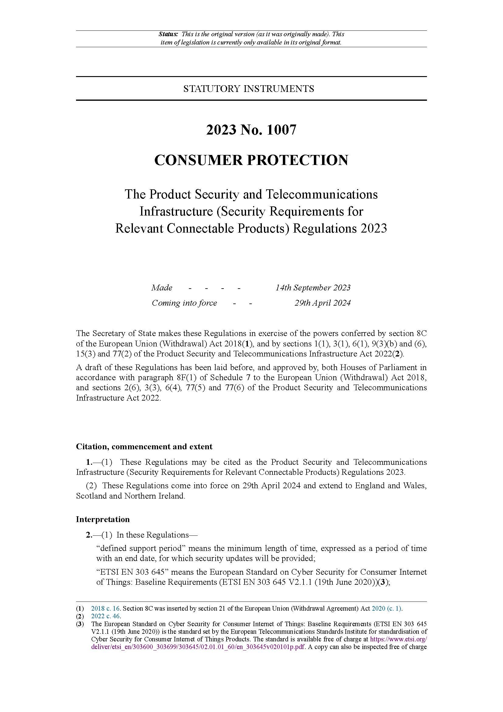 2023年10月,英国政府宣布PSTI法规即《产品安全和电信基础设施(相关可连接产品的安全要求)法规2023》(英文:The Product Security and Telecommunications Infrastructure (Security Requirements for Relevant Connectable Products) Regulations 2023),于2023年9月14日正式立法。