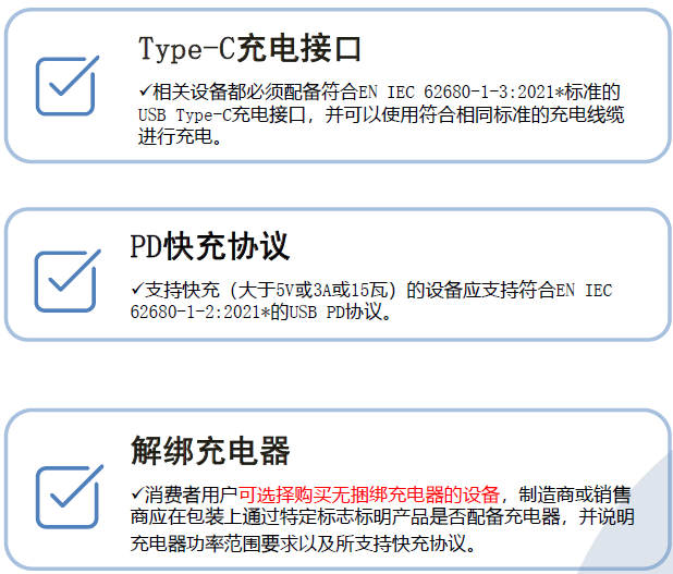 • 2022年12月7日的官方公报OJ正式发布关于通用充电器的修订指令Directive (EU)2022/2380,以补充RED指令Directive2014/53/EU中3.3(a)对通用充电接口的具体实施要求。