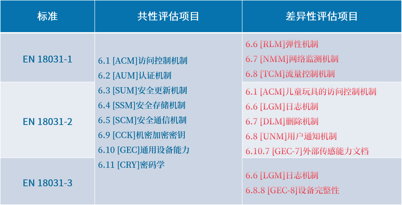 其中安全资产在三个标准中均有要求,而其他三种分别对应EN 18031-1/2/3三个标准,根据资产类型有不同的侧重点。