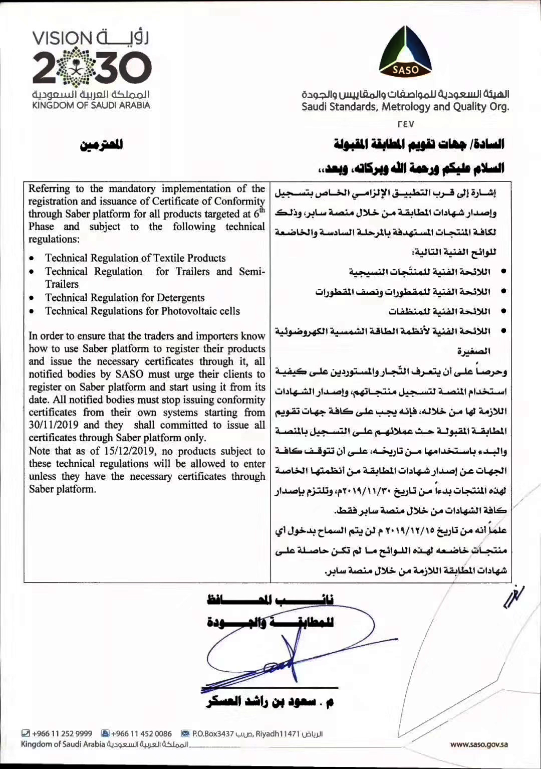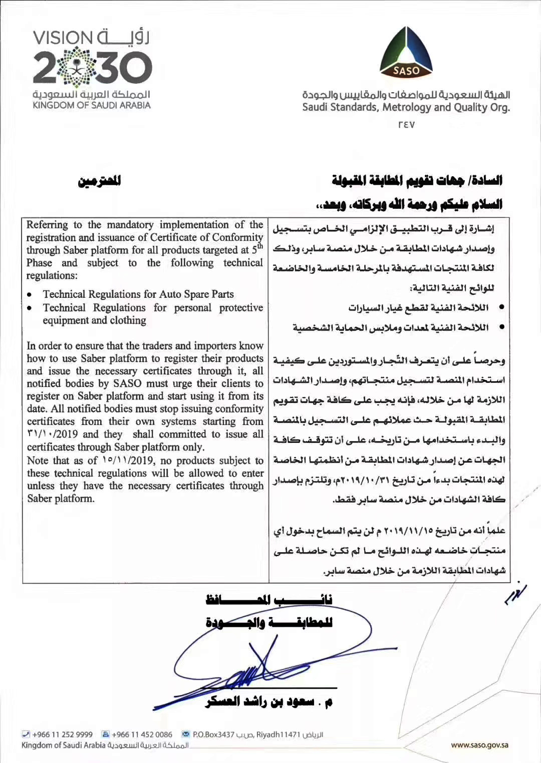 沙特阿拉伯 —2019年11月1日强制执行SABER注册