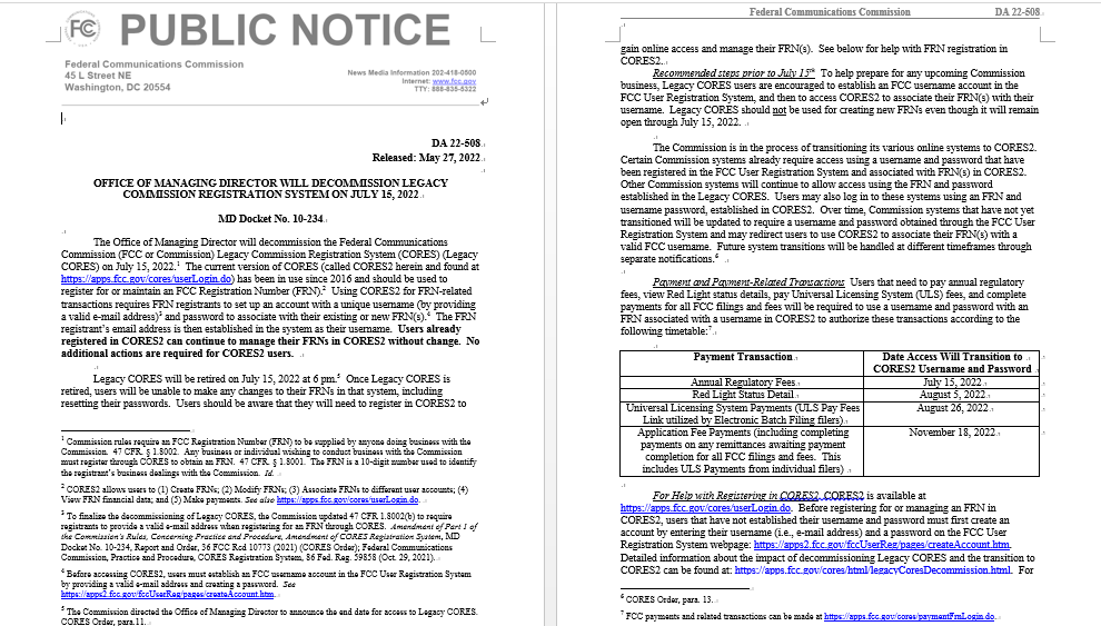 近期FCC发布官方信息,将于2022年7月15日关闭旧的FRN注册系统the legacy Commission Registration System(简称CORES),开始使用新版本的系统CORES2。