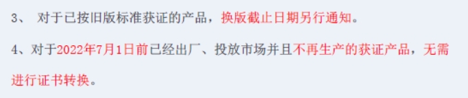 对于已获证的产品,以下CQC官方宣贯文件截图供参考。目前是EMC标准换版,对于已获证且还需要生产出货的则需要进行标准换版,但暂时还没有设立过渡期。