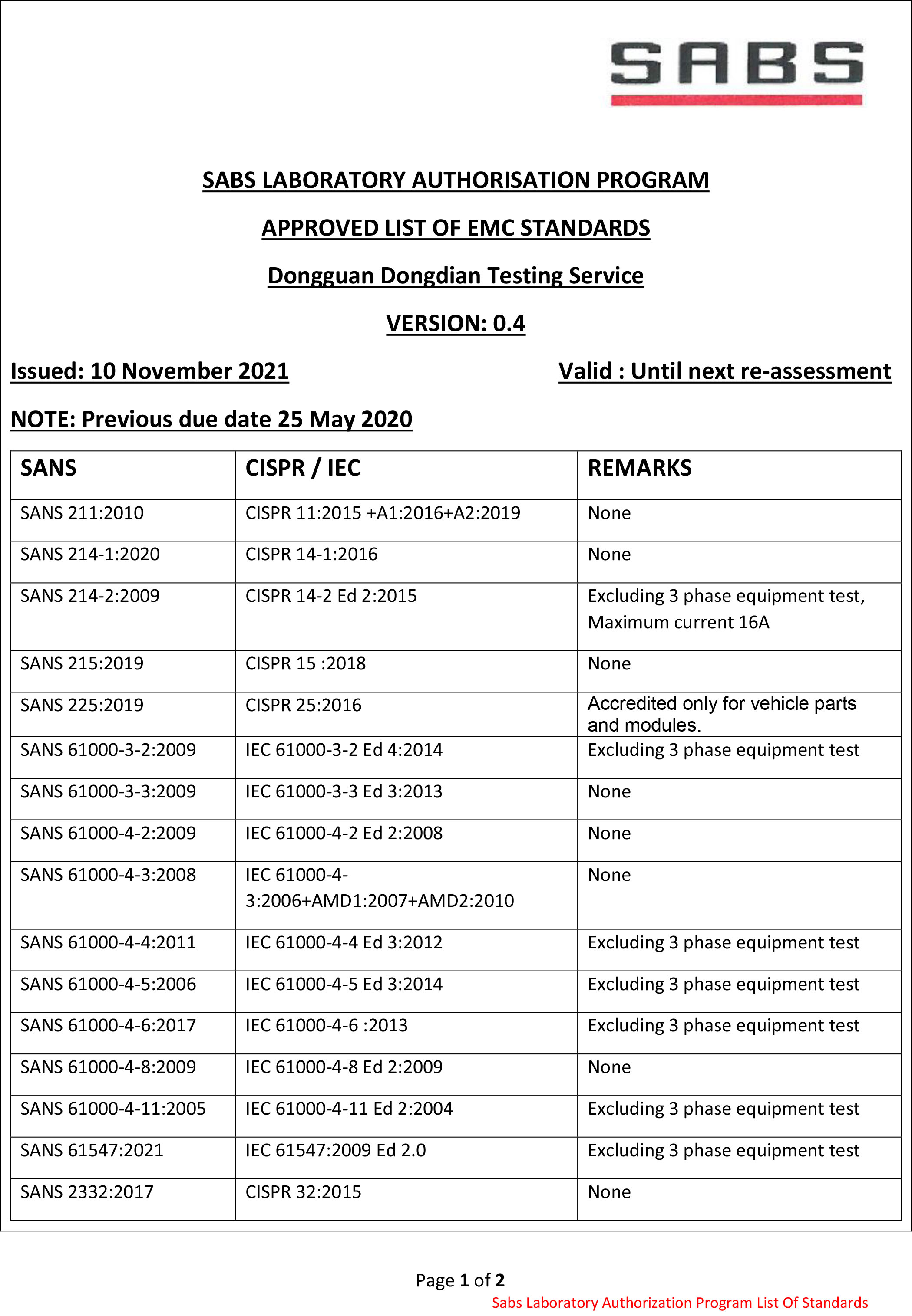 在2017年,东电检测EMC实验室已通过了SABS的审核,正式成为南非SABS的授权实验室 A-Lab,这意味着东电检测可以为出口南非的电子电气产品供应商提供产品符合性检测,并出具报告、申请EMC CoC证书。东电检测作为SABS的授权实验室之一,不仅在周期上具有根本性的优势,且拥有一批资深的SABS认证专家团队,可向客户提供一站式的SABS测试和认证解决方案,为客户的新产品成功进入国内和国际市场保驾护航。