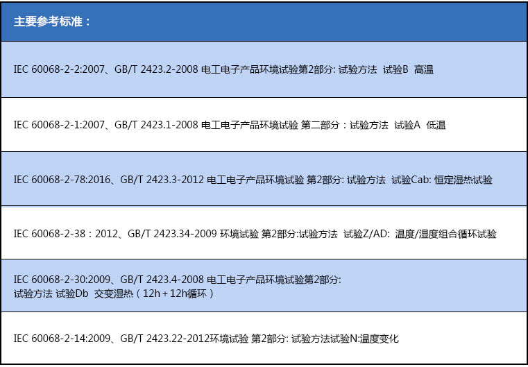 试验项目:高/低温试验、稳态湿热试验、温度循环试验、温湿交变试验